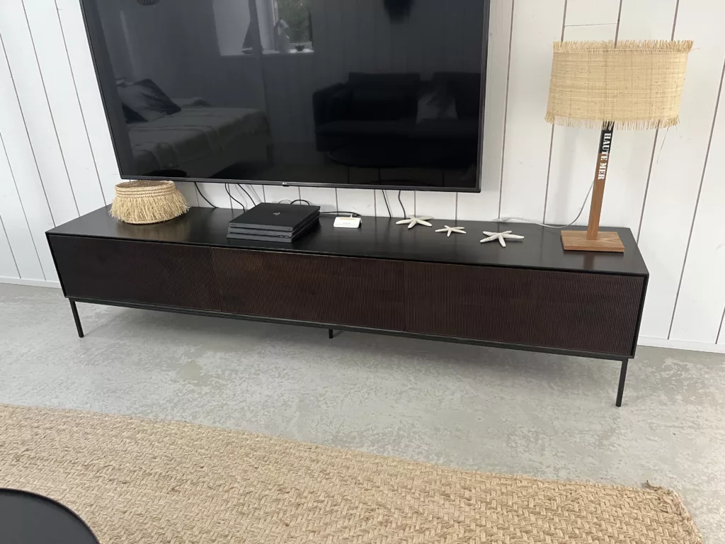 Ce meuble TV en chêne teinté wengé dispose de 2 grands tiroirs de part et d’autre et d’une porte abattante au centre.