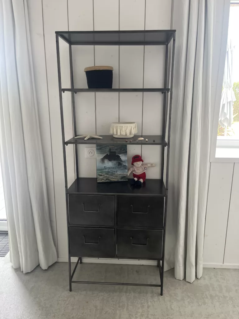 Etagère de chambre ou d’entrée avec 4 tiroirs et 4 niveaux de rangement.